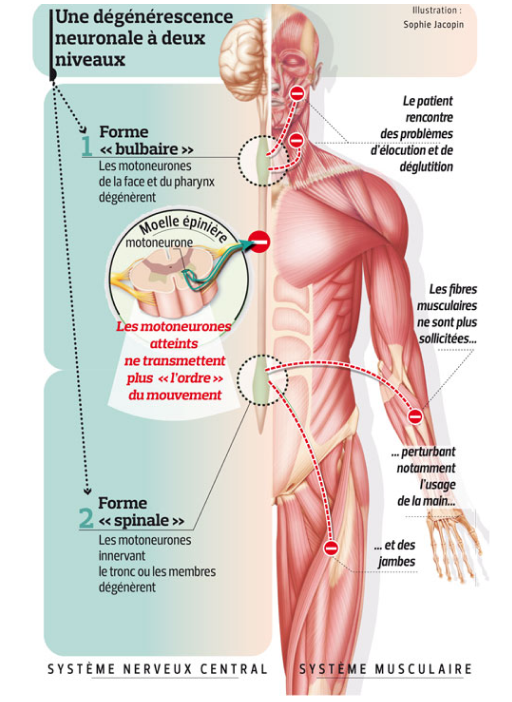 La SLA est une atteinte des fibres qui proviennent du motoneurone central et qui cheminent dans la partie latérale de la moelle épinière. Localisés dans le système nerveux central et dans la moelle épinière, les motoneurones commandent les muscles volontaires qui nous aident à marcher, à parler et à respirer. Ces muscles responsables de la motricité servent à contrôler les mouvements (par opposition à des muscles comme le cœur, muscle impossible à commander).